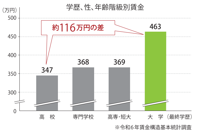 日本福祉大学の正科生として卒業すると、通学制の4年制大学と同じ大卒資格である「学士」を取得することができます。求人面においては「大卒以上」に応募ができ、就職・転職時の幅が広がります。また、収入面においても一般的に高校卒や専門学校・短大卒に比べて賃金や退職金に差が出ることが多く、将来のキャリア・収入面において様々なメリットを得ることができます。