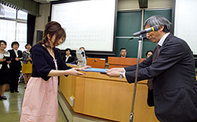 雨森通信教育部長より成績優秀表彰者の石塚麻由美さん、優秀論文表彰者の山内裕子さん、大裏瑞穂さん、西友加さん、松下直美さんに表彰状が授与されました。