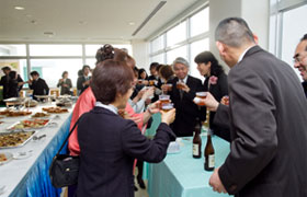 学位記授与式終了後、12号館6階にあるレストランに移動して通信教育部主催の卒業記念懇親会が行われました。加藤学長の挨拶ではじまった懇親会には、北海道から沖縄まで全国各地から、今までで最も多い124名の卒業生が参加され、教職員と卒業の喜びを分かち合うとともに、今後のさらなる研鑽と活躍を誓い合いました。懇親会の最後には、笹川美由紀さんから卒業生代表の挨拶として、入学した時の喜び、学友や教職員に支えられて卒業できたことへの感謝の言葉が述べられました。