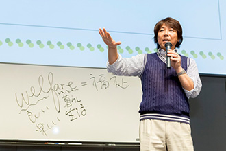 まずは担当教員による全体講義。「福祉の専門職」とは、他職種連携の方法や福祉現場の職員の葛藤などを中心に講義が行われました。