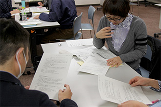 ゲスト講義終了後はグループワークで理解を深めます。理念がサービス提供とどのようにかかわっているかについて記述した「事前課題」に基づき、「理念が指針となって人材育成がおこなわれているか否か」が議論されました。